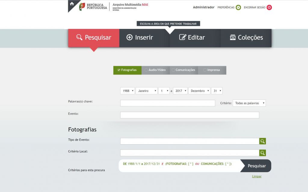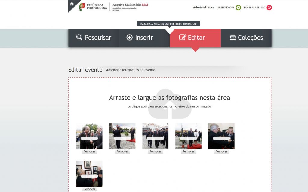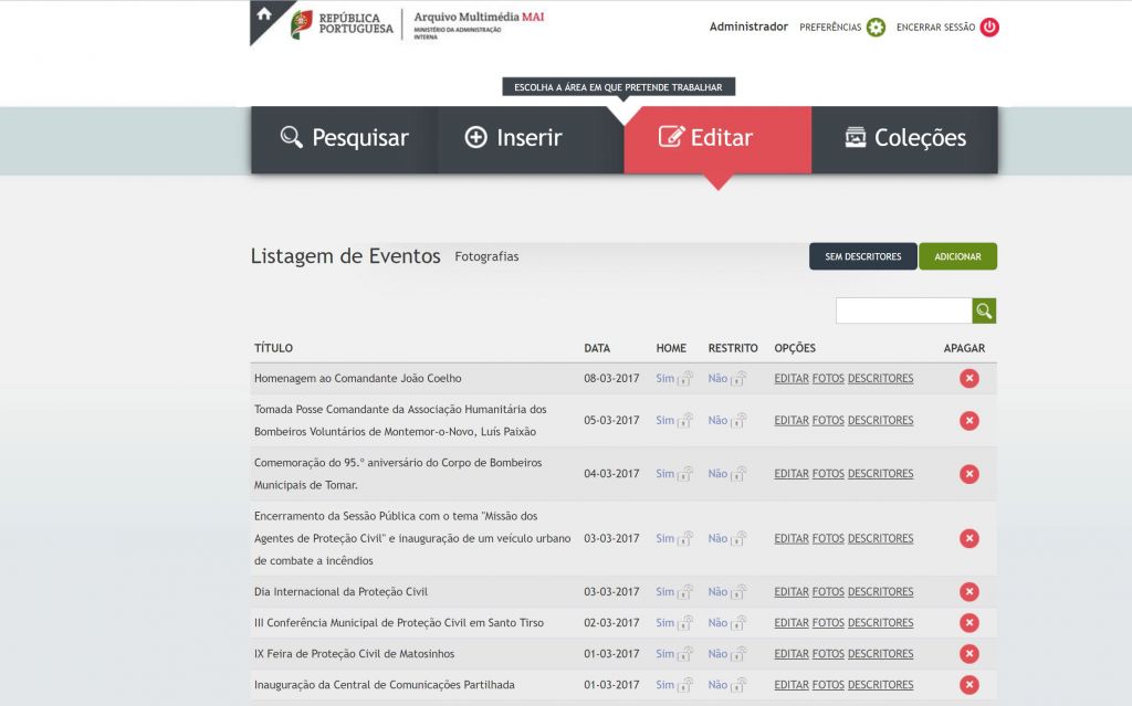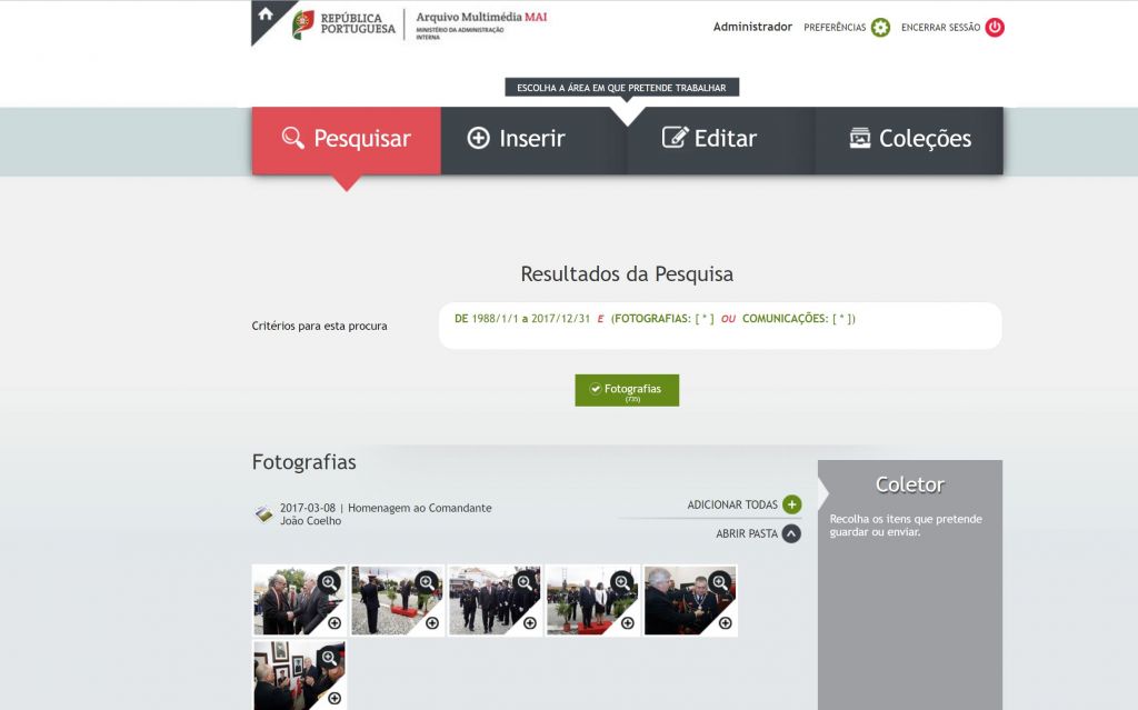 Acervo documental, pesquisável, de fotografias, vídeos e documentos recolhidas nos diversos eventos do Ministério da Administração Interna
